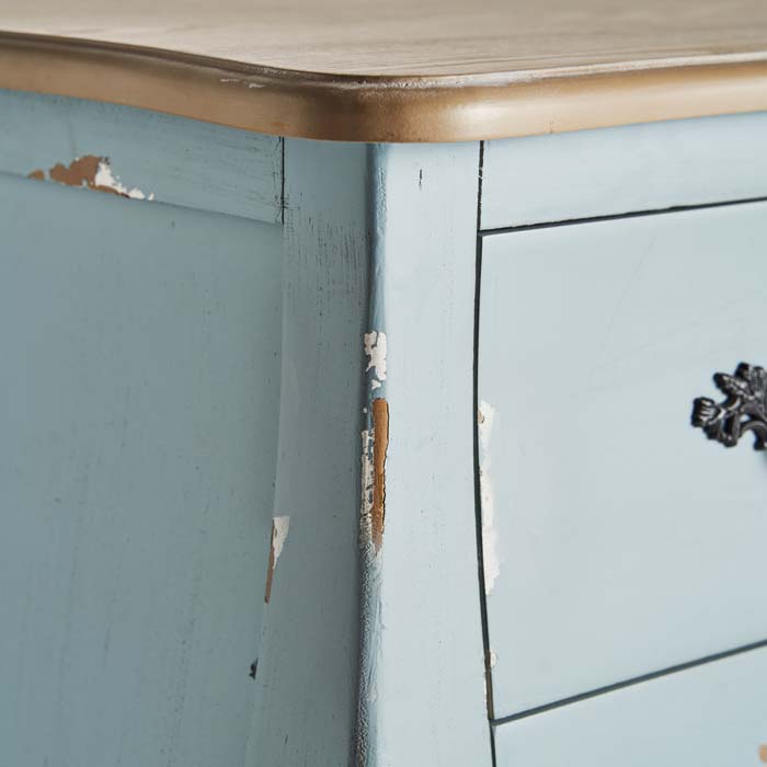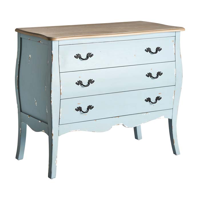 La cómoda Venecia encaja perfectamente dentro del estilo provenzal gracias a su diseño con líneas curvas, su material natural como la madera de abeto y su color azul pastel. Está compuesta por tres cajones y un tablero superior en color natural. Una pieza con mucho carácter y a la vez sencilla y cálida.