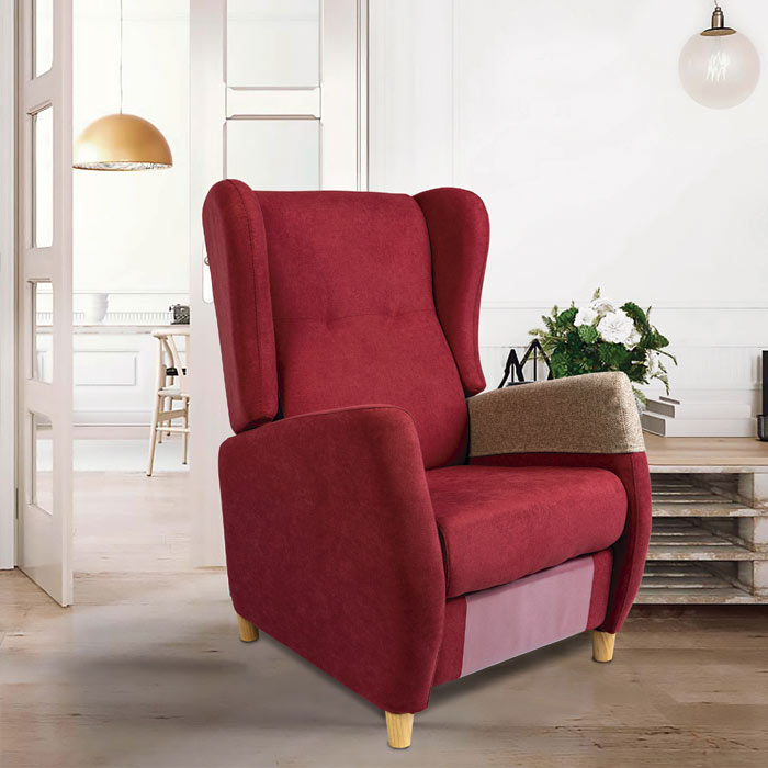 Sillón de empuje suave , patas de color Nogal ö Pino, Densidad asiento y respaldo 30Kg/m3 suave, respaldo acolchado con fibra. Opción manguitos en brazos.